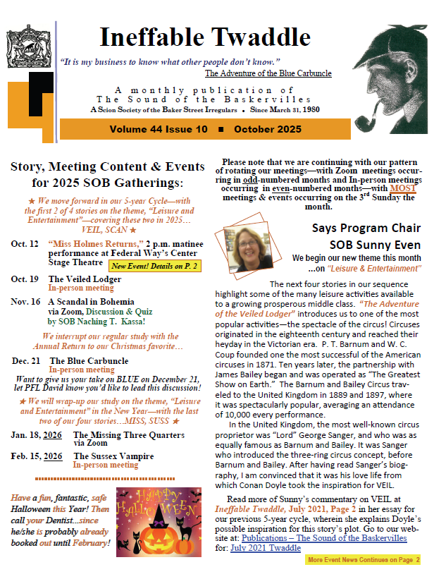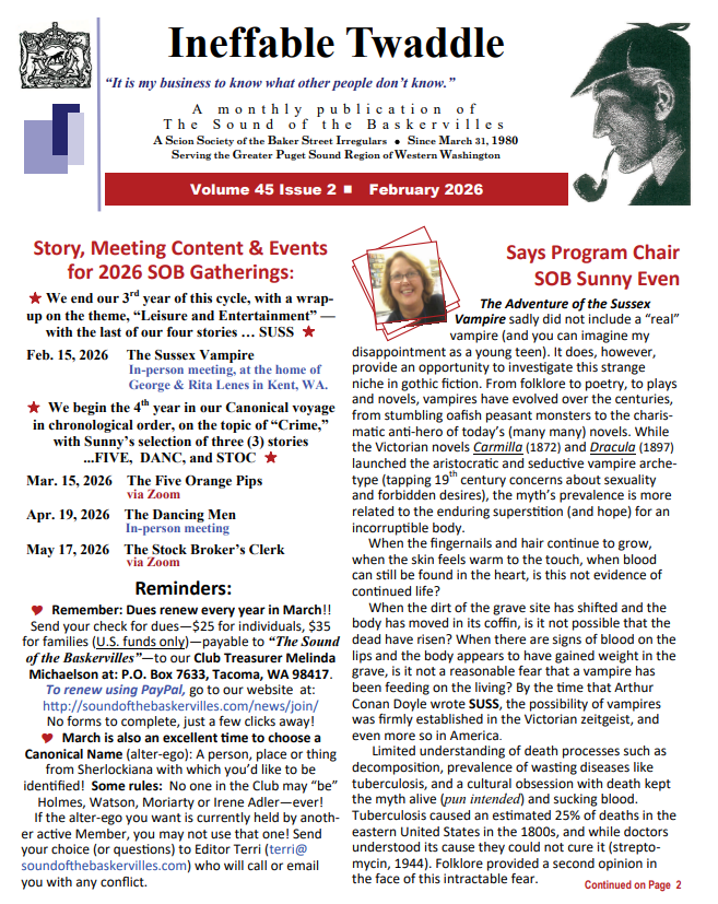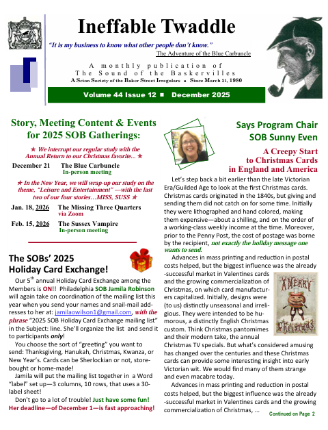 The membership newsletter, Ineffable Twaddle, publishes monthly. See links below for the most current issue and the archive. Once each year, the SOBs publish an original collection of written works from our membership, Beaten’s Christmas Annual. This bound 30+ page collection of pastiche, puzzles, artwork, scholarship, and humor is included with membership in the SOBs, or can be purchased from the club for $10.