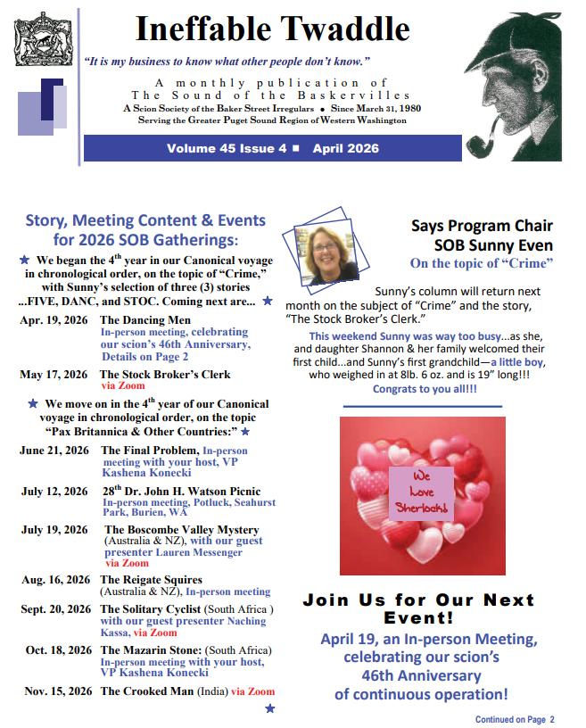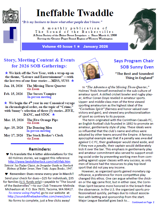 The membership newsletter, Ineffable Twaddle, publishes monthly. See links below for the most current issue and the archive. Once each year, the SOBs publish an original collection of written works from our membership, Beaten’s Christmas Annual. This bound 30+ page collection of pastiche, puzzles, artwork, scholarship, and humor is included with membership in the SOBs, or can be purchased from the club for $10.